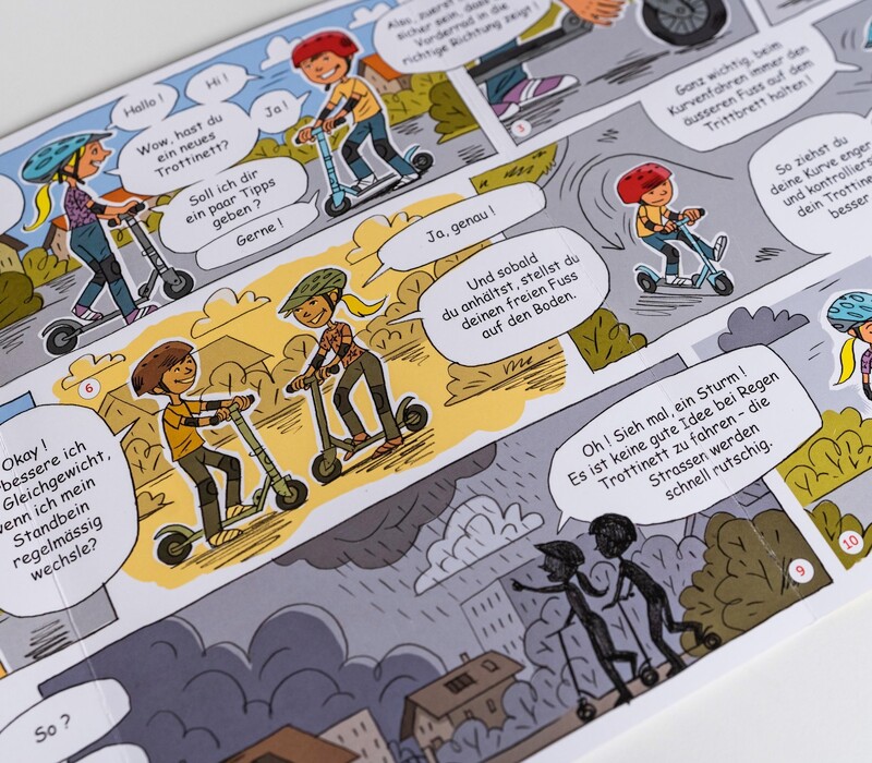 Der Comic in dieser kleinen Broschüre erlaubt es den Kindern, die 10 goldenen Regeln des sicheren Fahrens mit einem Tretroller zu erleben. Neben verschiedenen Tipps und Tricks, die das Trottinettfahren erleichtern, gibt dieses Dokument Auskunft über die Ausrüstung eines solchen Geräts und die Verkehrsregeln, die damit beachtet werden müssen.