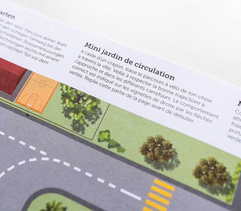 Mini jardin de circulation est un plan A3 représentant un grand carrefour. Les enfants de 10-12 doivent tracer le bon chemin pour aller à l'école, et qui passe nécessairement par ce carrefour. L'exercice a donc pour but de tracer les voies correctes à emprunter dans une situation routière complexe. Un corrigé est proposé dans la marge droite de la feuille.
