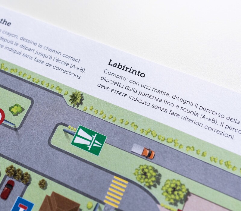 Il labirinto è un foglio A3 che raffigura una veduta aerea di un quartiere abitativo. È destinato ai bambini tra i 10 e i 12 anni. Tenendo conto dei pannelli della segnaletica e delle regole di precedenza che costellano la strada, i bambini sono invitati a tracciare il giusto percorso per arrivare a scuola. Nel margine destro del foglio, a titolo di richiamo, sono raccolti i significati dei principali cartelli di circolazione e delle marcature stradali.